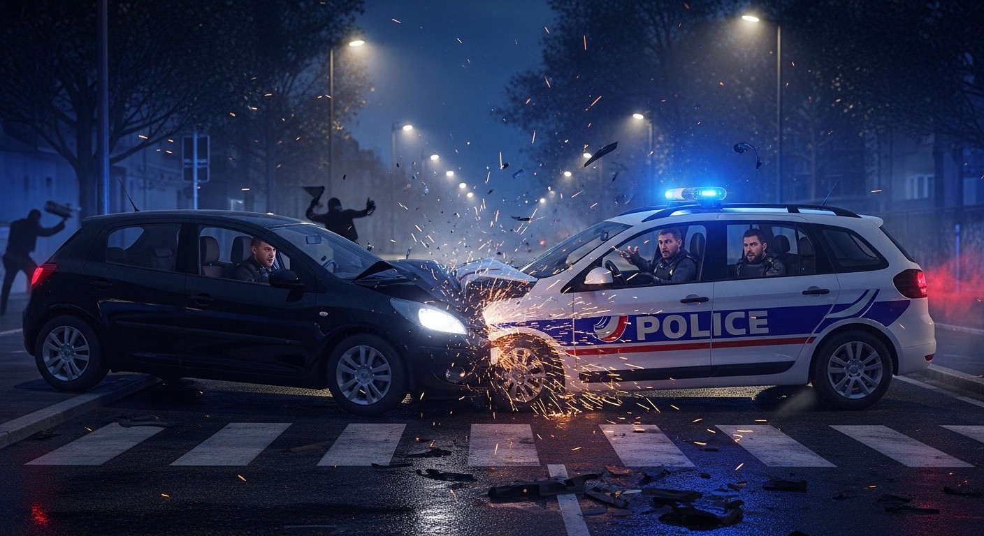 Après une brève échappée, le fuyard a opéré un demi-tour brutal. Il a foncé sur la voiture des policiers, provoquant un choc frontal ou latéral violent selon les descriptions. Le véhicule de police a été endommagé, et les quatre agents à l’intérieur ont subi le contrecoup immédiat du choc. Choqués et légèrement blessés, ils n’ont pas pu poursuivre immédiatement l’intervention.