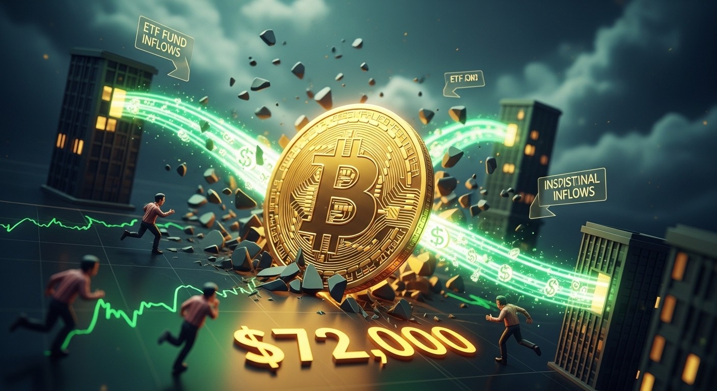 Le prix du Bitcoin a touché un pic intraday proche de 72 000 dollars, marquant son niveau le plus élevé depuis plusieurs semaines. Cette ascension rapide n’est pas le fruit du hasard : elle résulte d’une combinaison astucieuse entre des entrées d’argent frais via les produits financiers réglementés et une dynamique technique favorable sur les marchés dérivés.