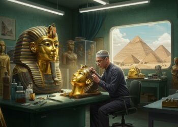 Dans les laboratoires du Grand Musée Égyptien, des restaurateurs redonnent…