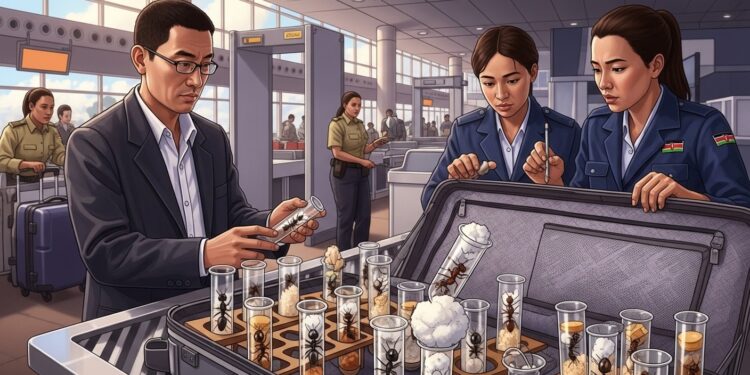 Les faits sont précis et documentés. Lors d’un contrôle de sécurité à l’aéroport Jomo Kenyatta, les autorités ont découvert plus de 2 200 fourmis dissimulées dans les bagages du prévenu. Parmi elles, près de 1 950 appartenaient à l’espèce Messor cephalotes, communément recherchée pour ses caractéristiques particulières. Ces insectes étaient majoritairement placés dans des tubes à essai, certains contenant du coton imbibé d’une solution sucrée pour assurer leur survie pendant le transport.