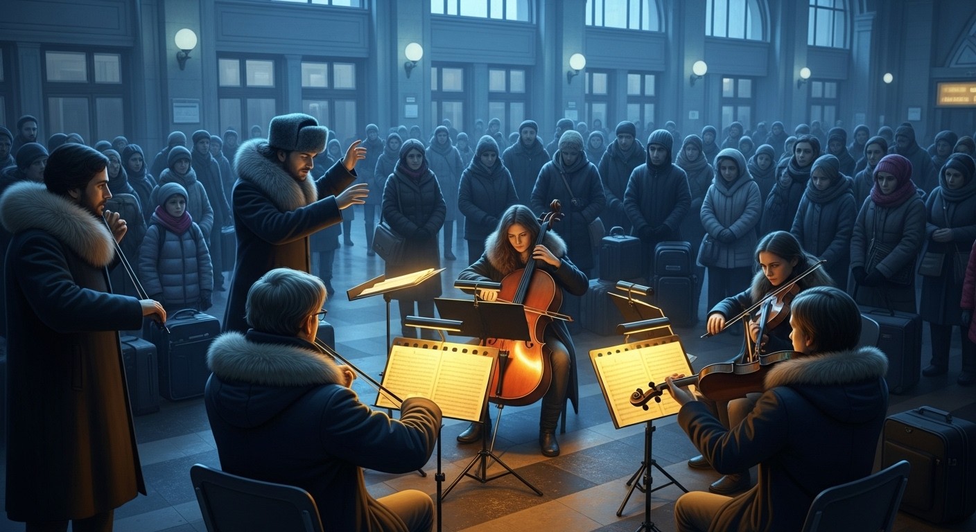 Imaginez une gare immense, habituellement bruyante et fonctionnelle, soudain enveloppée par les notes délicates d’instruments à cordes. Vendredi soir, à la gare centrale de Kiev, l’Orchestre classique de Kiev a offert un concert impromptu pour apporter un peu de chaleur humaine à ceux qui traversent ces temps difficiles. Entre les alertes aériennes qui rythment la vie quotidienne, neuf musiciens ont joué pendant près d’une heure, transformant la vaste salle d’attente en un havre inattendu de sérénité.