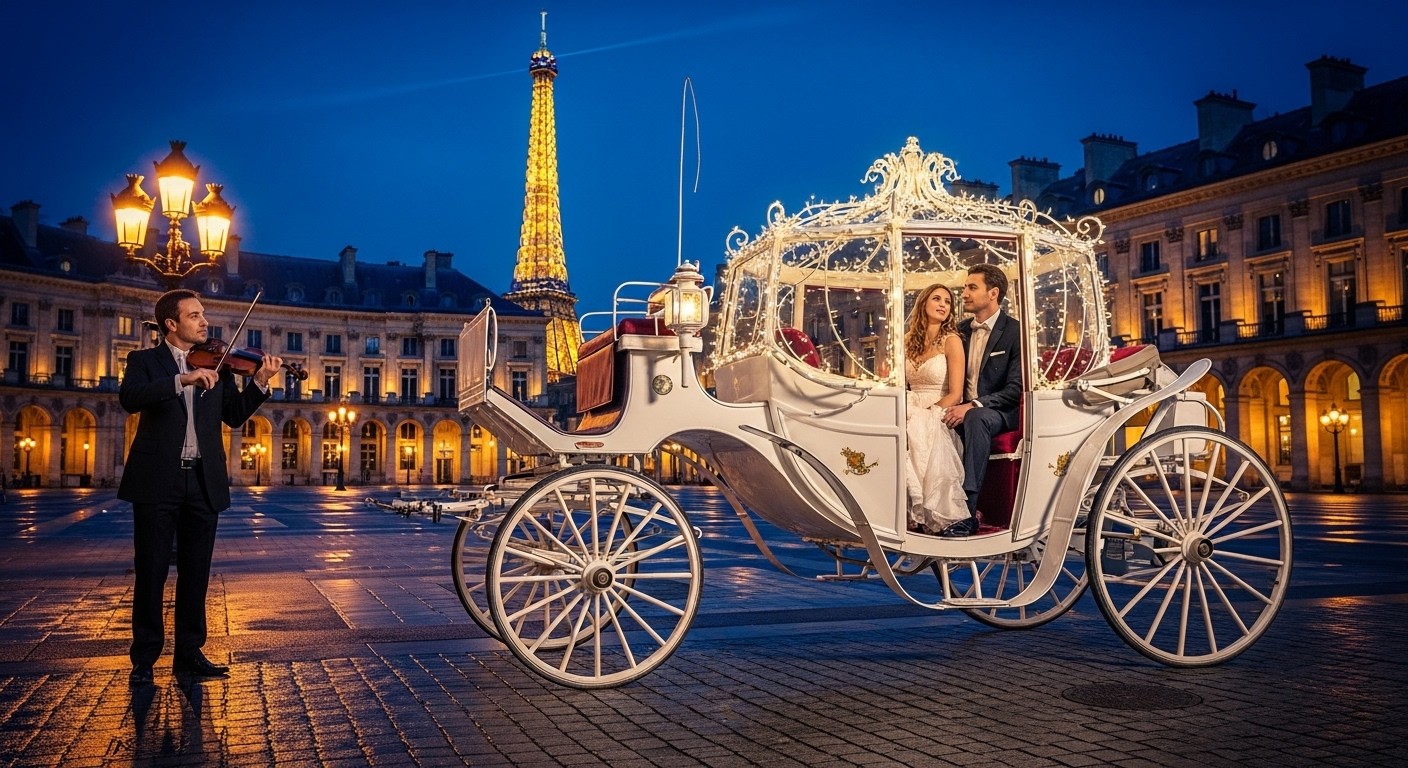 Imaginez une nuit parisienne où un carrosse blanc tiré par un cheval traverse la prestigieuse place Vendôme, illuminée par les vitrines des joailliers de luxe. À l’intérieur, un couple découvre un escarpin de verre scintillant, symbole d’un conte de fées moderne. Sous les accords d’un violoniste, l’homme s’agenouille devant la Tour Eiffel pour poser la question ultime. Cette scène, digne d’un film romantique, n’est plus réservée aux productions hollywoodiennes : elle est devenue une réalité pour de nombreux couples à Paris.