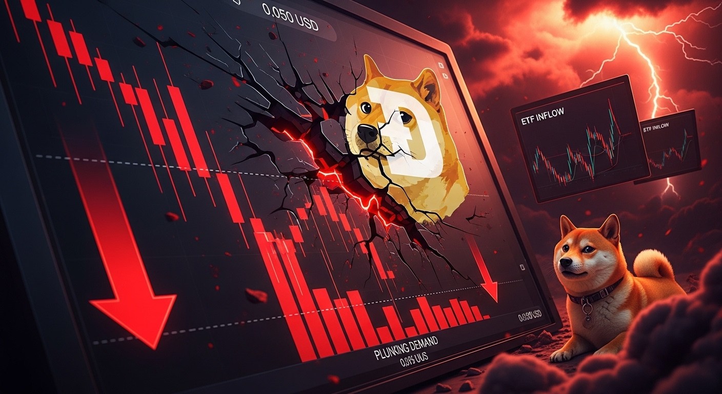 Le Dogecoin s'effondre sous 0,10 $ avec un pattern tête-épaules multi-années qui menace de l'envoyer vers 0,05 $. Les ETF restent désespérément vides et l'intérêt sur les futures s'évapore... Vers un point bas historique ?