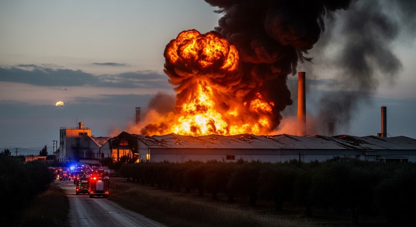 Vers quatre heures du matin, une puissante détonation a retenti dans la nuit, entendue à plusieurs kilomètres à la ronde. Très vite, les flammes ont envahi une partie importante des installations de cette biscuiterie située non loin de la ville de Trikala, à environ 245 kilomètres au nord-ouest d’Athènes. L’explosion a été si violente qu’elle a provoqué l’effondrement du toit sur une section entière de l’usine.