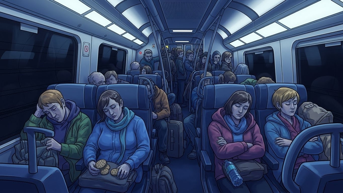 Dans l’obscurité du wagon, beaucoup ont essayé de trouver le sommeil. Assis ou allongés comme possible, les passagers somnolaient par intermittence, réveillés par les annonces sporadiques promettant un départ proche qui ne venait jamais.