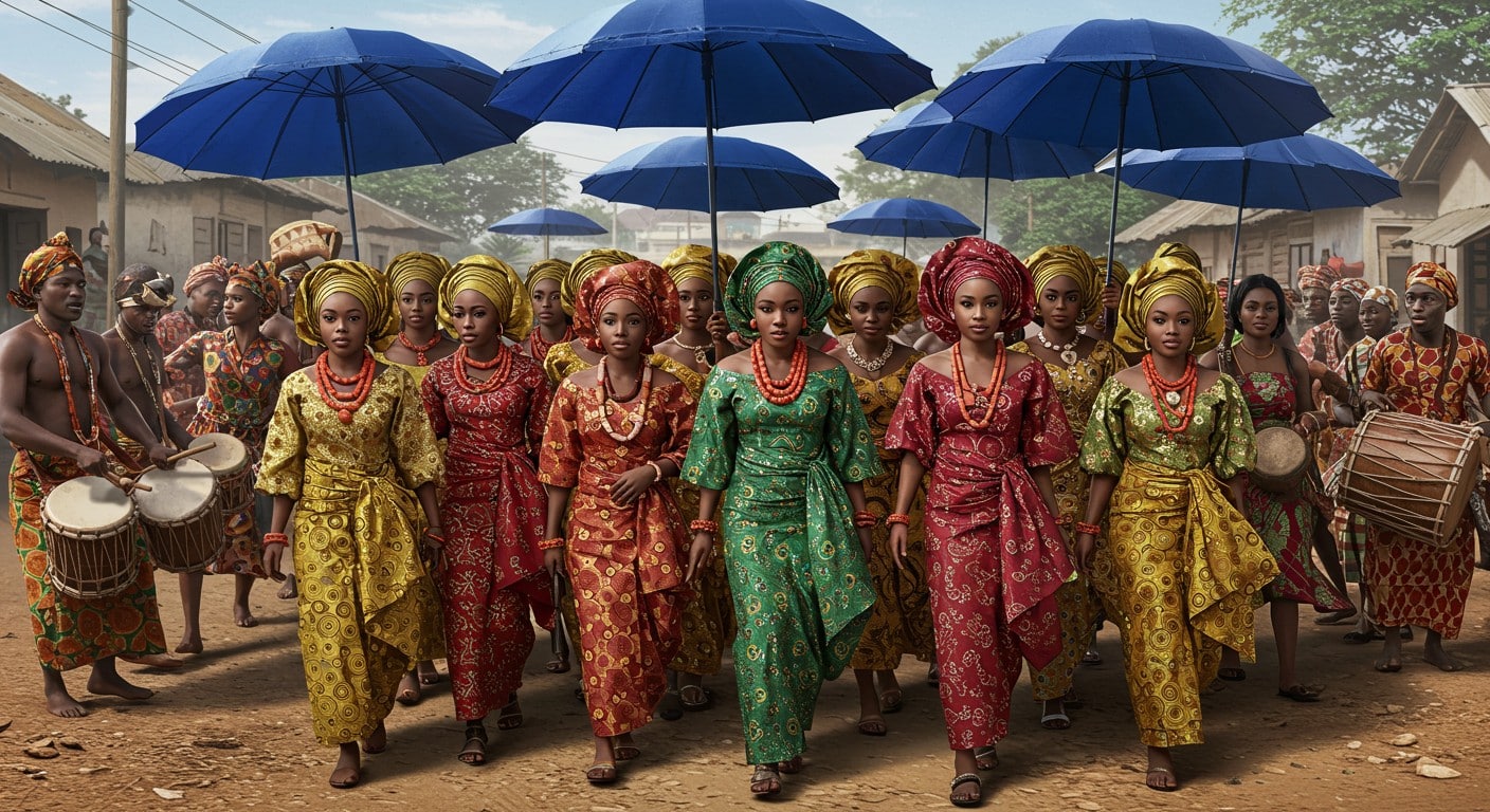 Puis vient le moment tant attendu : la procession dans les rues de Shao. Abritées sous de larges parapluies bleus pour se protéger du soleil nigérian, les jeunes femmes avancent en file harmonieuse. Leurs robes en Aso oke, tissu traditionnel aux teintes vives, captent la lumière et éblouissent les spectateurs.