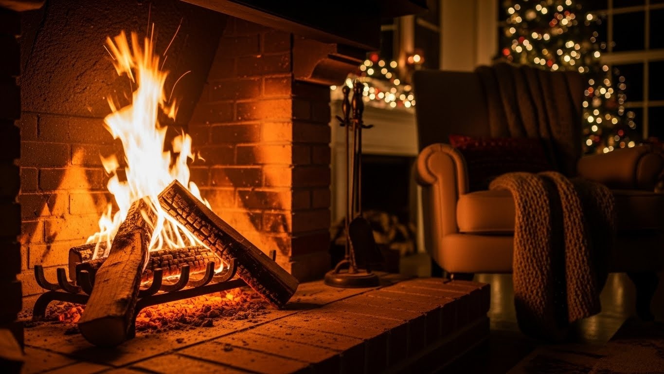 - Feu de cheminée ambiance Noël avec décorations scintillantes et musique douce en fond