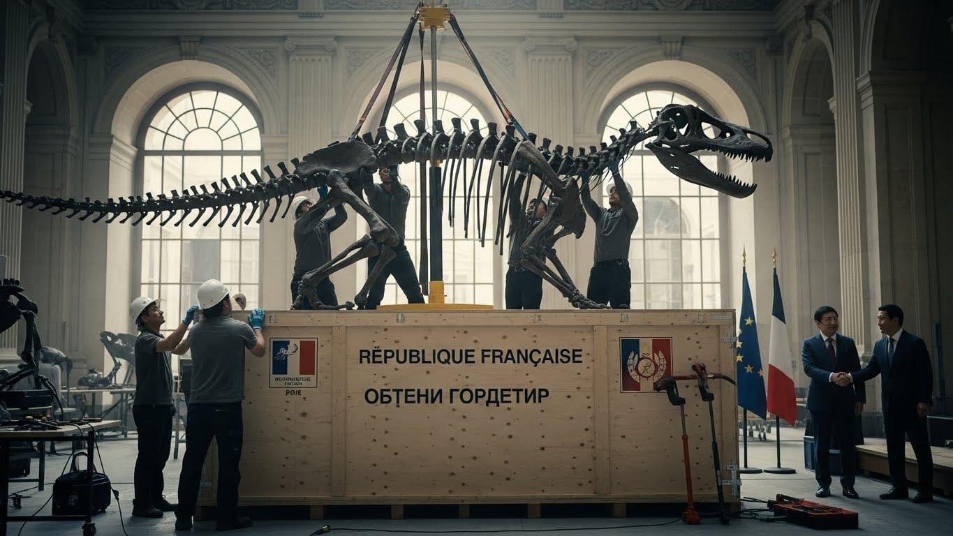 Ce matin, la ministre des Comptes publics remettra officiellement aux autorités mongoles un spécimen exceptionnel de Tarbosaurus bataar, ce tyrannosauridé asiatique souvent présenté comme le proche parent du légendaire Tyrannosaurus rex. Avec lui voyageront une trentaine d’autres pièces paléontologiques, dont de précieux œufs de dinosaures.