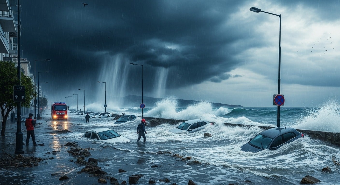 À Glyfada, banlieue sud d’Athènes, une femme de 56 ans a été emportée par les eaux et coincée sous une voiture balayée par le courant. Cette zone, mixte entre pentes et littoral, a souffert intensément.