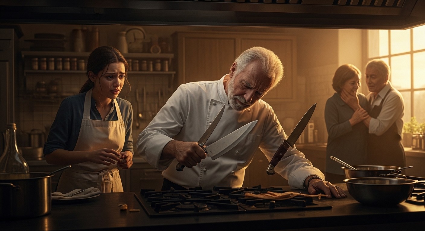 Le chef, déjà affaibli par sa maladie du foie, succombe brutalement avant d’avoir pu révéler son état à sa famille ou officialiser le don des couteaux. Jim est effondré, pleurant son grand-père sans connaître toute la vérité sur les intentions de Dominique envers Zoé.