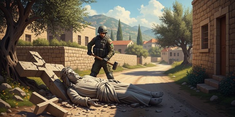 L’incident s’est produit dans le sud du Liban, une région marquée par des années de tensions et récemment le théâtre d’opérations militaires intenses. Un soldat des forces israéliennes, en mission dans cette zone sensible, a été photographié en train d’utiliser une masse pour frapper la tête d’une statue représentant Jésus crucifié. La statue, qui avait visiblement déjà chuté de sa croix, subit des coups qui ont rapidement été qualifiés de profanation par de nombreux observateurs.
