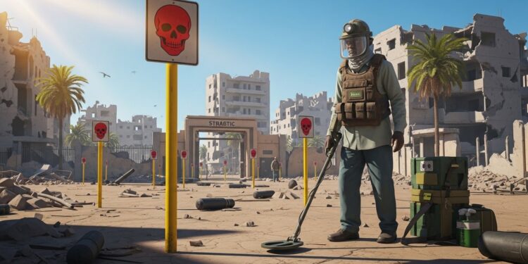 Dans l’un des espaces verts les plus appréciés de la ville, le parc d’Al-Mugran, le contraste est saisissant. D’un côté, des poteaux peints en jaune délimitent les zones déjà sécurisées. De l’autre, des panneaux rouges ornés de têtes de mort rappellent le péril qui rôde encore. C’est ici que des équipes spécialisées opèrent depuis plusieurs mois pour rendre cet endroit aux habitants.