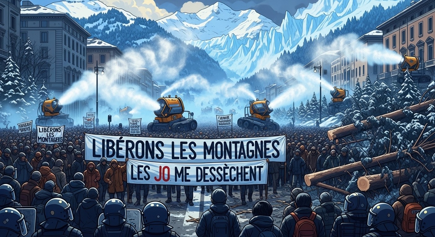 Les canons à neige fonctionnent à plein régime, prélevant des ressources précieuses dans des zones déjà sous tension hydrique. Les manifestants soulignent que cette pratique accélère la dégradation des écosystèmes alpins, où les glaciers reculent à vue d’œil. Une banderole particulièrement évocatrice montrait une goutte d’eau accompagnée du message clair : les Jeux dessèchent les montagnes.