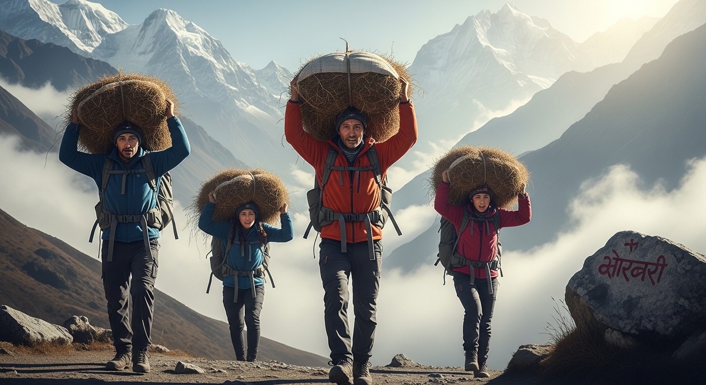 Le véritable défi attendait ensuite : un trek de 12 kilomètres dans le massif des Annapurna, avec un sac de foin porté sur la tête, à la manière traditionnelle des sherpas. Une sangle frontale maintenait la charge, transformant chaque pas en calvaire. Les candidats ont dû affronter non seulement la fatigue physique mais aussi les éléments : altitude, sentiers escarpés et même des sangsues tenaces qui ont ajouté une couche de difficulté inattendue. Certains ont crié leur épuisement, d’autres ont frôlé la rupture.