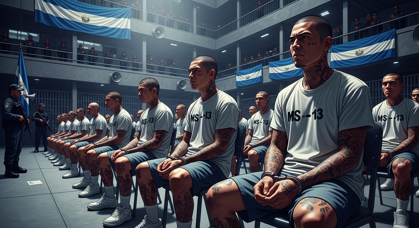 Imaginez une cour de prison où des centaines d’hommes, tatoués du cou jusqu’au crâne, restent parfaitement immobiles sur des chaises en plastique. Menottés aux mains et aux pieds, vêtus simplement d’un tee-shirt et d’un short blancs, ils écoutent sans broncher des voix qui sortent des haut-parleurs. Ces voix racontent des actes d’une brutalité extrême : tortures, brûlures, assassinats commandés de sang-froid. C’est la scène glaçante qui se déroule actuellement au Salvador dans le cadre d’un procès historique contre l’un des gangs les plus redoutés d’Amérique centrale.