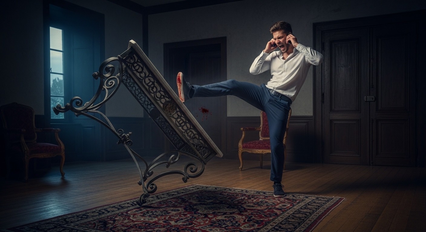 Et là, le geste irrépressible arrive. D’un coup de tibia puissant, il frappe de toutes ses forces une table massive en fer forgé surmontée d’un plateau en marbre. Le meuble, loin d’être léger, effectue un vol impressionnant de près de deux mètres avant de s’écraser. Le bruit résonne dans tout le château. Le choc est physique, mais aussi psychologique. Georges-Alain réalise immédiatement la gravité de son geste : sa jambe saigne abondamment.