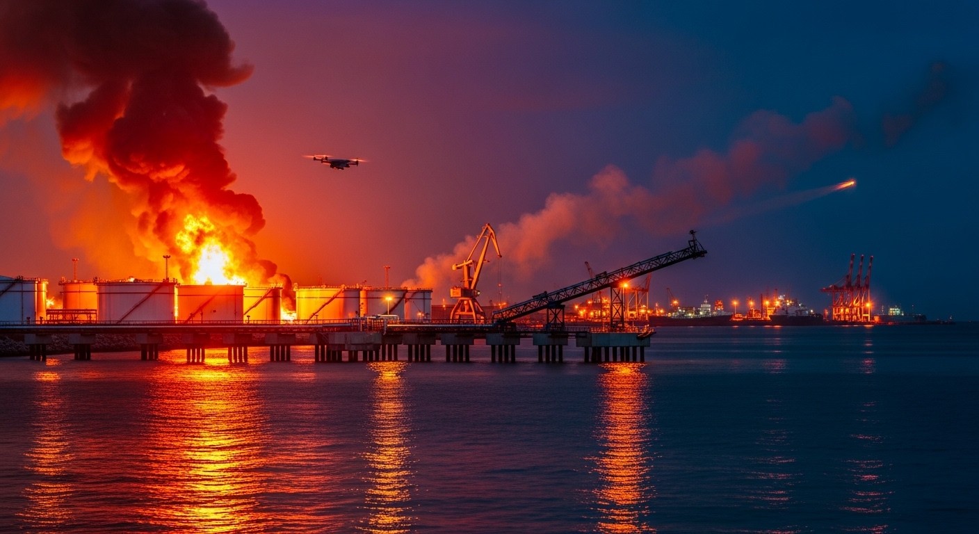 Imaginez un port stratégique en mer Noire, plongé dans la nuit, soudain illuminé par des lueurs orangées d’incendies. Des réservoirs de pétrole s’embrasent, des quais de chargement sont touchés, et l’ombre de drones plane au-dessus des eaux sombres. C’est précisément ce qui s’est produit récemment à Novorossiïsk, un hub essentiel pour les exportations russes d’hydrocarbures. Cet événement soulève des questions cruciales sur la poursuite du conflit et ses répercussions sur l’économie mondiale de l’énergie.