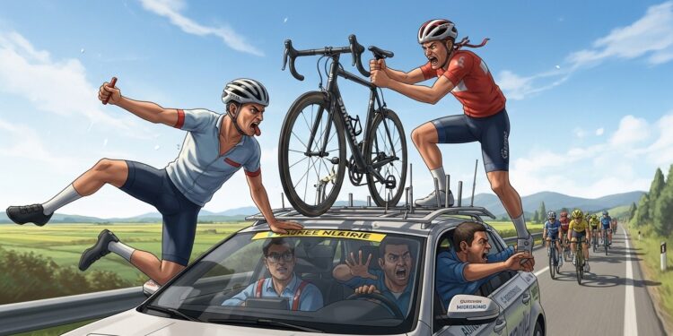 Selon les éléments rapportés par l’équipe, l’action s’est déroulée alors que la voiture suivait le déroulement de l’étape. Un spectateur a profité d’un arrêt momentané pour bondir sur le toit. Son objectif était clair : s’emparer d’un des vélos fixés sur le véhicule. Ces machines représentent non seulement un investissement important, mais aussi un outil essentiel pour les coureurs en compétition.
