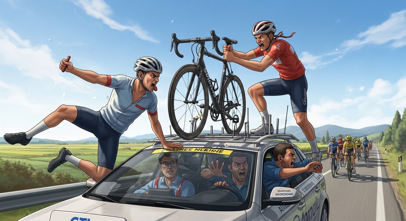 Selon les éléments rapportés par l’équipe, l’action s’est déroulée alors que la voiture suivait le déroulement de l’étape. Un spectateur a profité d’un arrêt momentané pour bondir sur le toit. Son objectif était clair : s’emparer d’un des vélos fixés sur le véhicule. Ces machines représentent non seulement un investissement important, mais aussi un outil essentiel pour les coureurs en compétition.