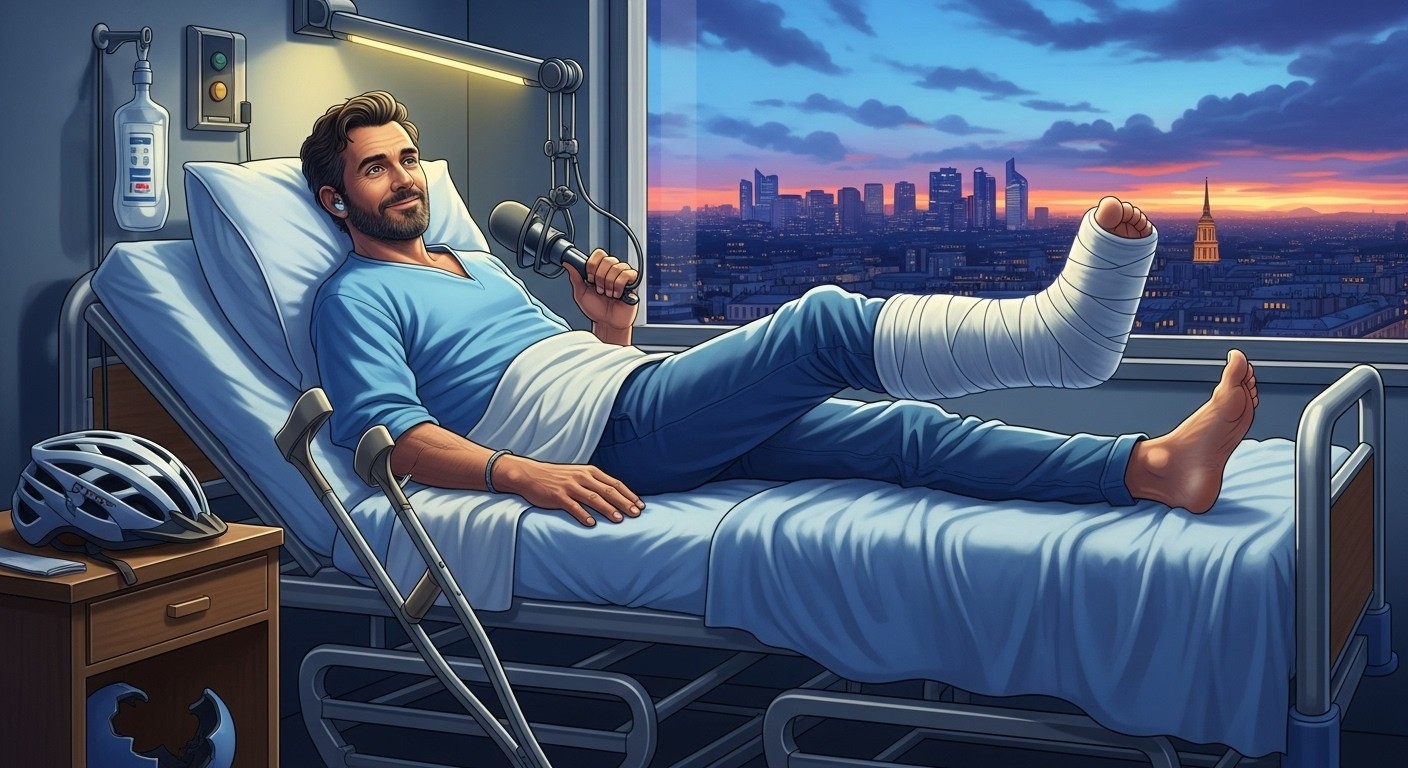 La nouvelle a circulé très vite sur les réseaux sociaux. Une photo publiée par l’intéressé lui-même a suffi à alerter ses fans et collègues. On y voit une jambe emprisonnée dans un imposant plâtre, un lit d’hôpital typique des établissements parisiens, et surtout, un message qui tente de garder le sourire malgré les circonstances.