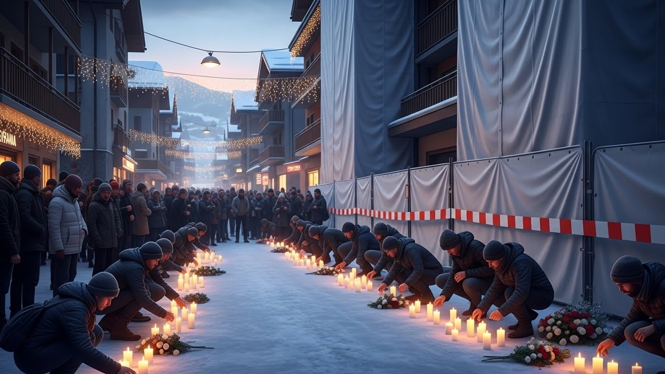 Le soir du jeudi suivant le drame, la station de Crans-Montana, nichée dans les Alpes suisses, était enveloppée d’un froid intense. Devant les ruines masquées d’un établissement nocturne populaire, une foule s’est assemblée sans un mot. Des bougies vacillaient sur le sol gelé, des fleurs étaient déposées avec précaution. Ce lieu, autrefois animé par les rires et la musique, est devenu un mémorial improvisé pour ceux qui n’en sont pas revenus.