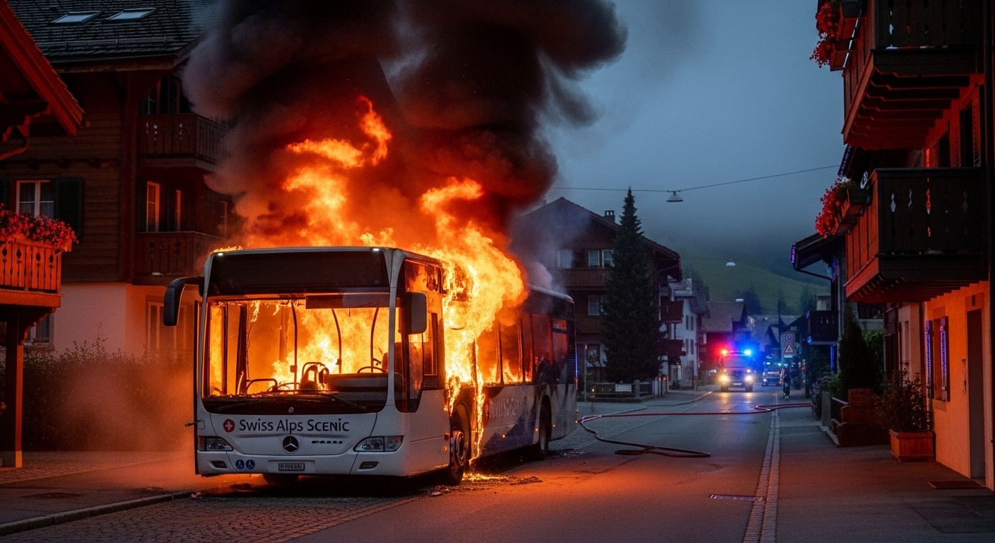 Le feu s’est déclaré vers 18h25 sur la rue principale de Kerzers, une commune tranquille du canton de Fribourg, à une vingtaine de kilomètres à l’ouest de Berne. L’autocar de transport régional, qui circulait normalement, s’est embrasé de manière spectaculaire. Des vidéos circulant sur les réseaux sociaux montrent des flammes impressionnantes jaillissant du véhicule, atteignant plusieurs mètres de hauteur et illuminant la scène d’une lueur orangée terrifiante.