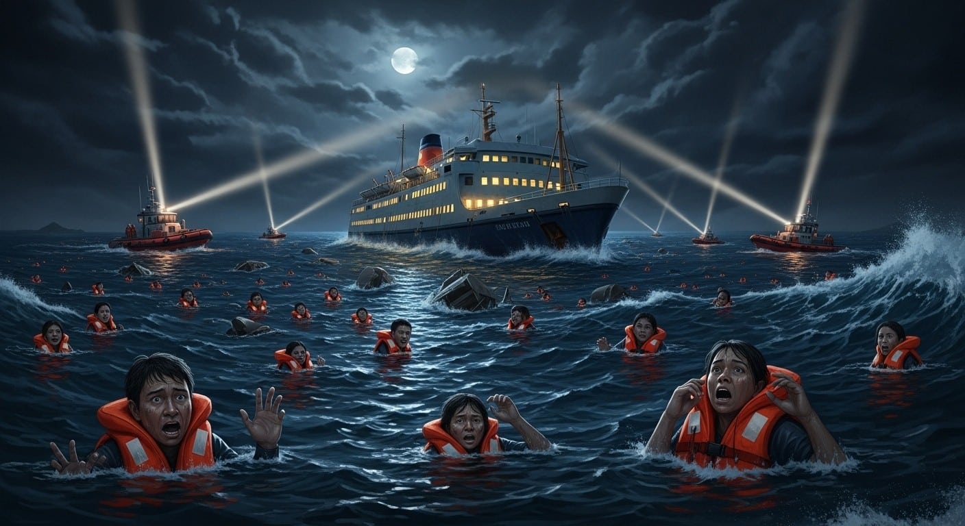 À seulement cinq kilomètres à l’est d’une petite île, le ferry a commencé à prendre l’eau rapidement. Le signal de détresse a été lancé presque immédiatement. Dans l’obscurité totale, les passagers ont dû réagir vite, enfilant des gilets de sauvetage, se précipitant vers les sorties ou sautant directement à la mer.