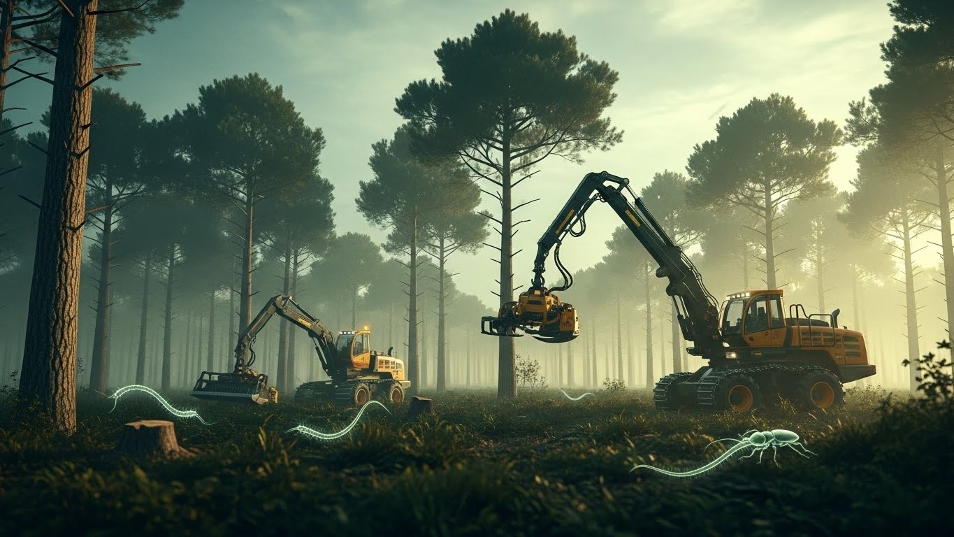 Dans les profondeurs verdoyantes des forêts landaises, un combat silencieux mais acharné se livre actuellement. Des machines imposantes, aux griffes d’acier, abattent méthodiquement des pins centenaires dans une course effrénée contre un ennemi invisible : un minuscule ver translucide capable de faire dépérir des arbres en quelques mois seulement. Cette menace, longtemps redoutée, est désormais bien réelle dans le sud-ouest de la France.